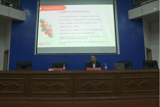 毛金明结合自己的大学学习经历和毕业就业创业历程,为在场员工讲解了作为一名商科员工,如何进行大学规划以及未来职业选择。他表示,当前中国经济正值高质量发展之际,社会对创新创业教育高度关注,但就中外企业发展对比来看,缺乏中高端管理人才是个紧迫问题。老员工应当培养独立思维能力,要摆正自我心态,脚踏实地,切记狂妄傲慢,抛弃自身偏见。当今中国正处于百年未有之大变局和中华民族伟大复兴,相比较过去,当今老员工拥有截然不同的发展规划和发展愿景,建议同学们选择处于更高价值链上的职业。同时,他指出商科员工未来职业的发展新方向:数字化金融和人工智能会计。作为商科员工,会计事务所、世界500强企业、金融投资机构、证券公司、商业银行等企业机构是员工就业的主要方向。如何提升自己的就业竞争力,他建议在校老员工应当培养差异化思维和英语口语能力,并围绕CMA、ACCA、CFA、FRM等专业化财经类证书和CICPA注册会计师考试的应用及社会认可度进行对比分析,为现场同学做了专业化解读。