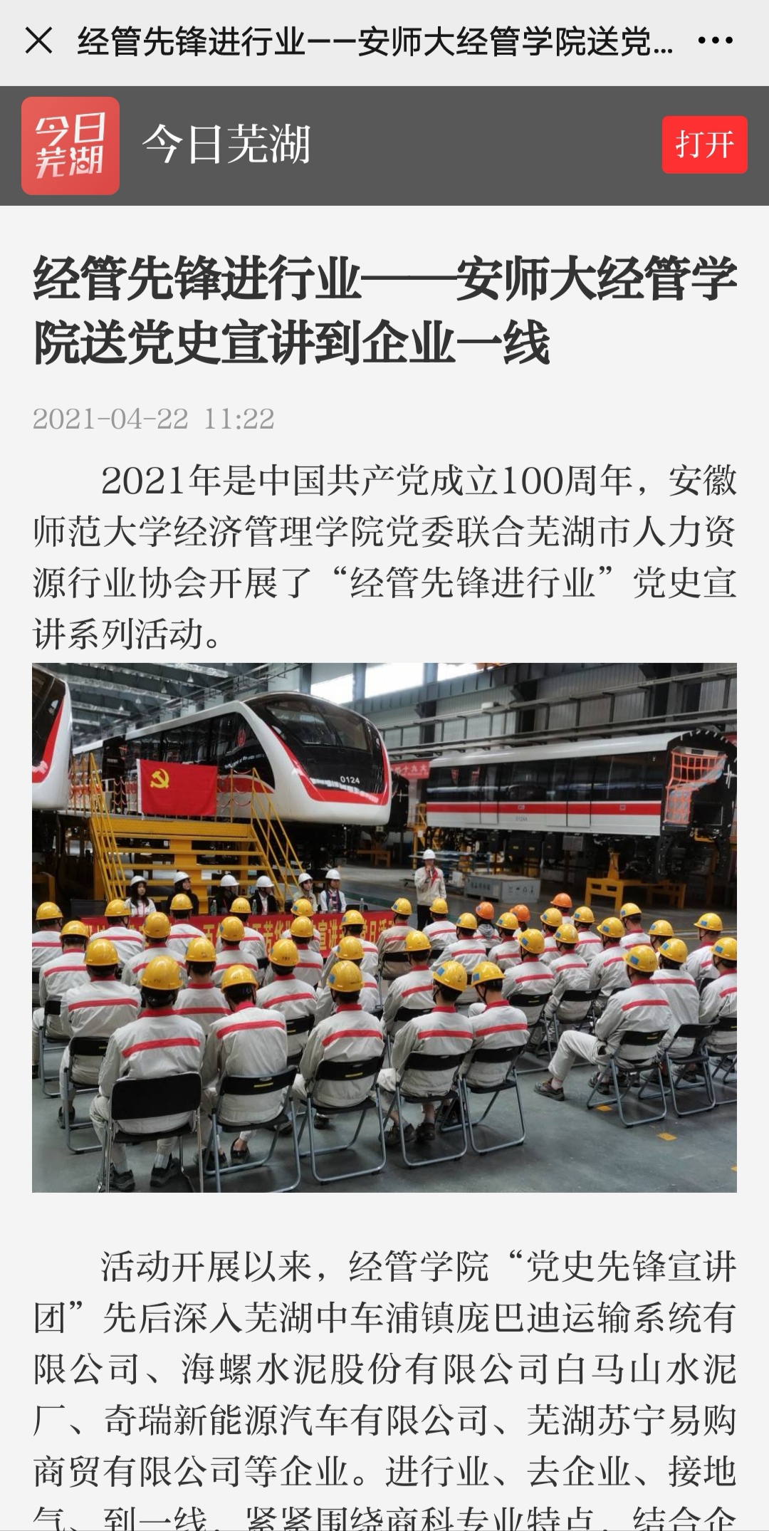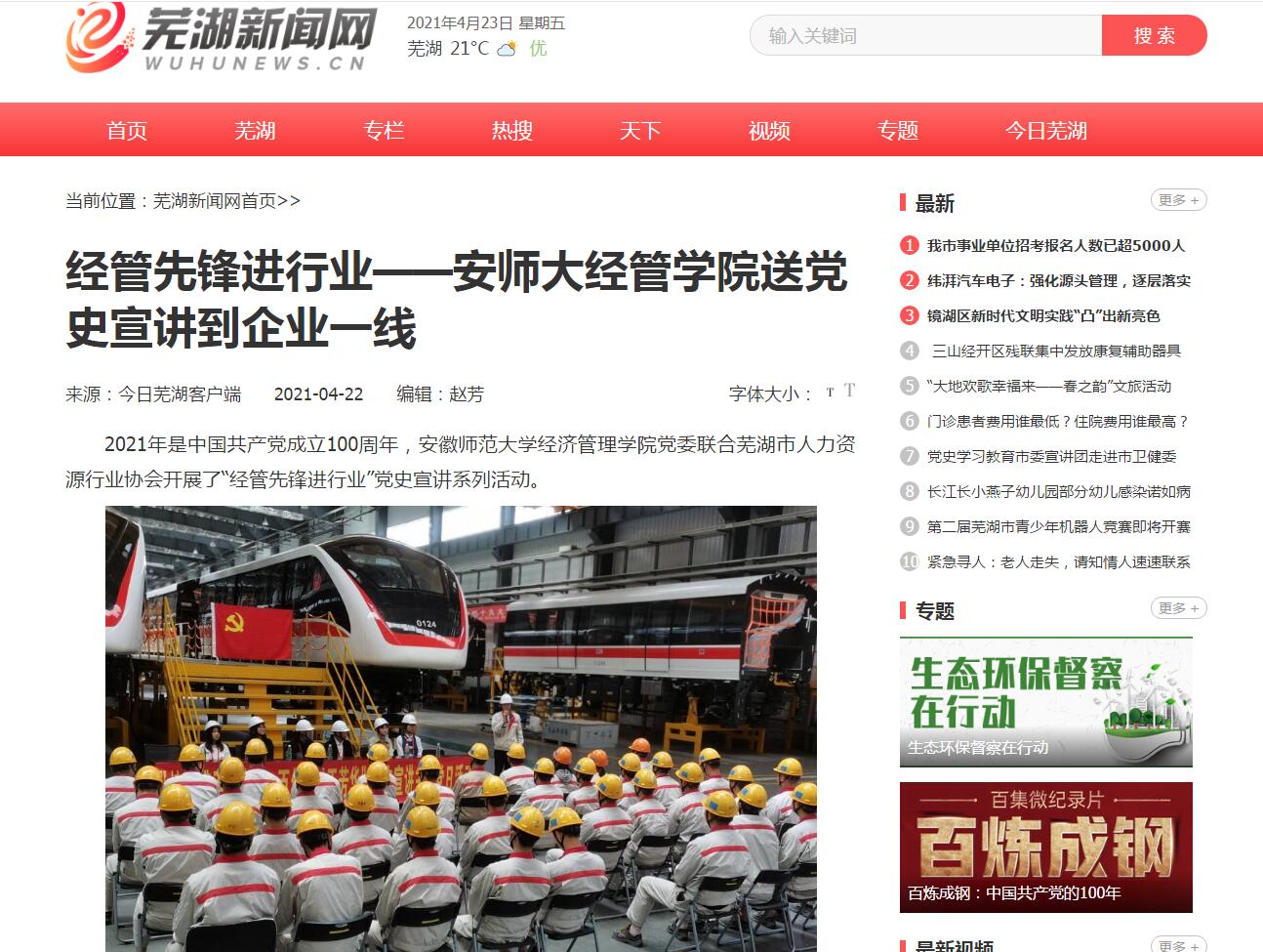 本网讯(m88官网 吕洋)今年是中国共产党成立100周年,为做好党史学习教育,开展好党史学习教育、党史宣讲活动,公司党委联合芜湖市人力资源行业协会开展“经管先锋进行业”系列活动,组织员工宣讲员进芜湖市相关行业、企业,进基层一线开展党史宣讲。截至目前,“经管先锋进行业”党史宣讲团已组织开展进芜湖市行业、企业宣讲活动16场,参与学习受益企业一线员工达800余人,活动得到了芜湖市人力资源行业协会和相关企业的一致好评。日前,活动被芜湖新闻网、今日芜湖等多家媒体报道。