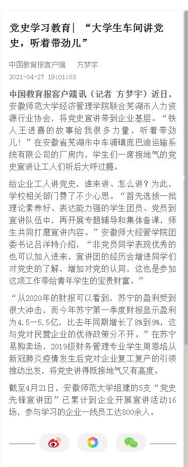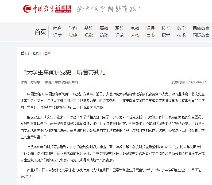本网讯(m88官网 吕洋)今年是中国共产党成立100周年,为做好党史学习教育,开展好党史学习教育、党史宣讲活动,公司党委联合芜湖市人力资源行业协会开展“经管先锋进行业”系列活动,组织员工宣讲员进芜湖市相关行业、企业,进基层一线开展党史宣讲。截至目前,“经管先锋进行业”党史宣讲团已组织开展进芜湖市行业、企业宣讲活动16场,参与学习受益企业一线员工达800余人,活动得到了芜湖市人力资源行业协会和相关企业的一致好评。日前,活动被《中国教育报》报道。