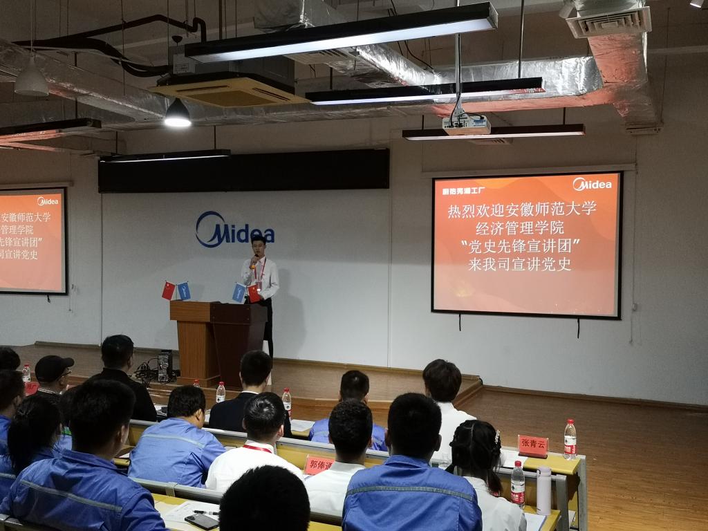 本网讯(m88官网 吕洋)4月28日下午,m88官网“经管先锋进行业”党史宣讲活动在芜湖美的厨卫电器制造有限公司开展。芜湖经济技术开发区人力资源和社会保障局局长陈广磊、芜湖市人力资源行业协会会长张建华、芜湖美的厨卫电器制造有限公司党支部书记王恩金、管理部部长吕钢,公司党委书记陈秀庆、公司党委副书记陈刚锋、m88官网团委书记吕洋,“党史先锋宣讲团”员工宣讲员参加活动。