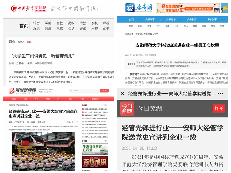 截止目前,“经管先锋进行业”党史宣讲团已组织开展进芜湖中车浦镇庞巴迪运输系统有限公司、奇瑞新能源汽车有限公司、海螺水泥白马山水泥厂、芜湖美的厨卫电器制造有限公司等芜湖市行业、企业宣讲活动21场,参与学习受益企业一线员工达1200余人,活动得到了芜湖市人力资源行业协会和相关企业的一致好评。活动先后收到《中国教育报》、中国教育新闻网、《安徽青年报》、芜湖新闻网、今日芜湖等媒体报道。m88官网“经管先锋进行业”党史宣讲团还将继续深入芜湖市企业一线,加强与行业协会、企业的联动,推动宣讲活动走深走实。
