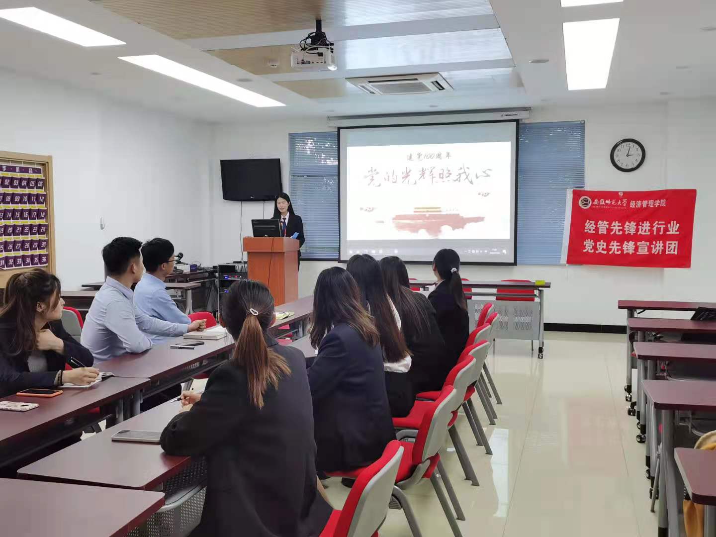 m88官网“党史先锋宣讲团”第五组组长王亚宁从宣讲活动的基本背景、宣讲内容、影响成效等方面介绍了“经管先锋进行业”宣讲党史的相关情况。