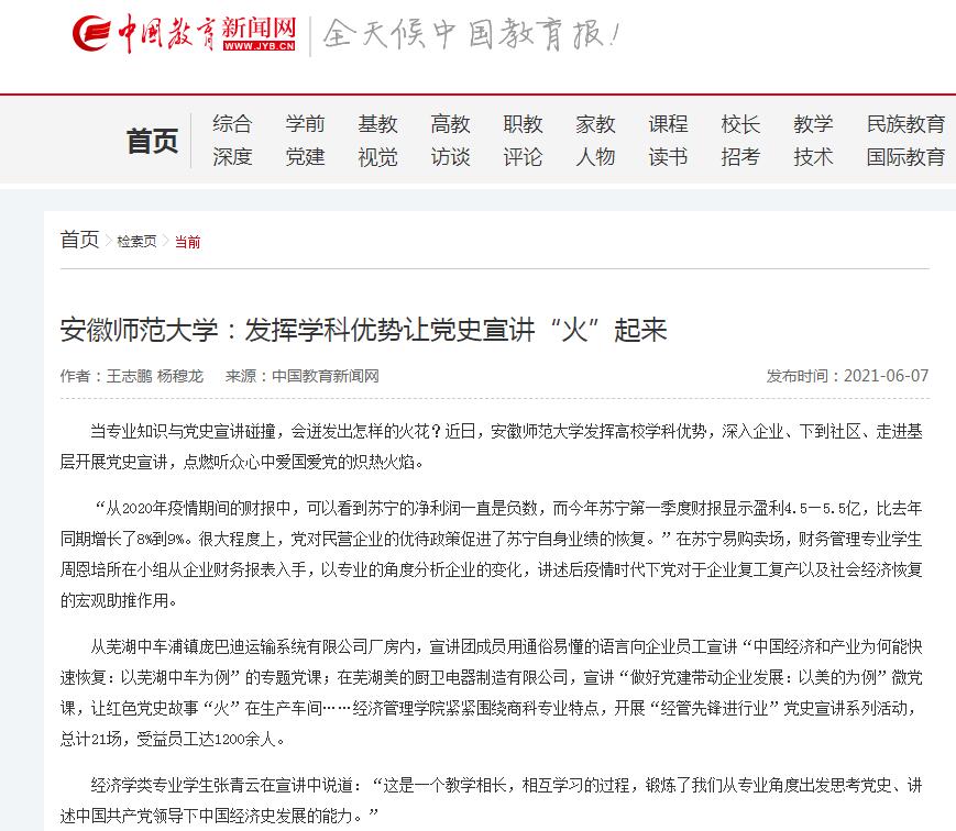 本网讯(m88官网 吕洋)为做好党史学习教育,开展好党史学习教育、党史宣讲活动,公司党委联合芜湖市人力资源行业协会开展“经管先锋进行业”党史宣讲系列活动。公司多次召开集体备课会、工作交流会帮助“党史先锋宣讲团”成员在宣讲中结合专业元素,把握正确导向,提升宣讲艺术。日前,“经管先锋进行业”党史宣讲活动被《中国教育报》报道。《中国教育报》报道链接:http://www.jyb.cn/rmtzcg/xwy/wzxw/202106/t20210607_595424.html