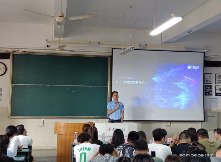 活动开始,中信证券芜湖部总经理郭千胜为同学们分别介绍证券行业的现状及预测、证券市场收入规模及预测、中信证券公司简介及业务情况,对于目前有就业意向的同学以及将来想要进入证券行业的同学们来说受益匪浅。接下来,郭千胜对于招聘的要求流程、新员工培养体系、公司的福利待遇等同学们的疑问作出详细的解答,并欢迎大家投递简历,希望有更多青年力量进入中信证券共同成长。