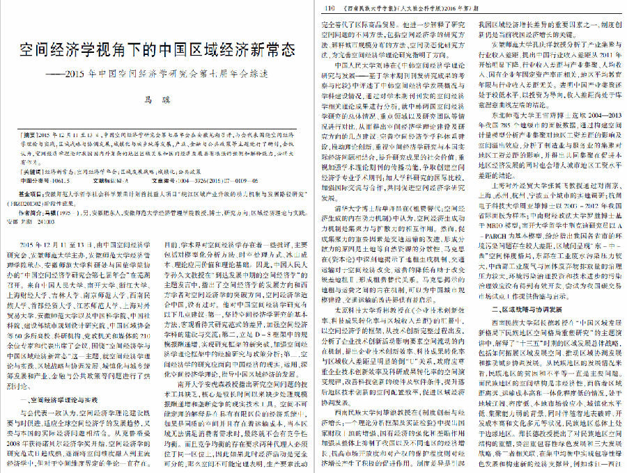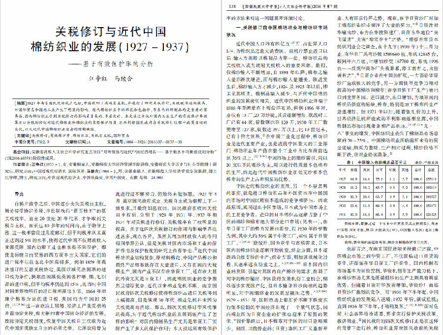 (m88官网 马骥)近日,《西南民族大学学报(人文社会科学版)》期刊2016年第7期,集中刊发了公司江争红博士与马陵合教授的《关税修订与近代中国棉纺织业的发展(1927-1937)——基于有效保护率的分析》、马骥教授的《空间经济学视角下的中国区域经济新常态》、汪洋副教授的《默会知识影响风险投资阶段选择研究》、韩玉刚副教授的《中国中部城市群区域R&D资源配置绩效评价研究——以皖江城市带为例》四篇论文。