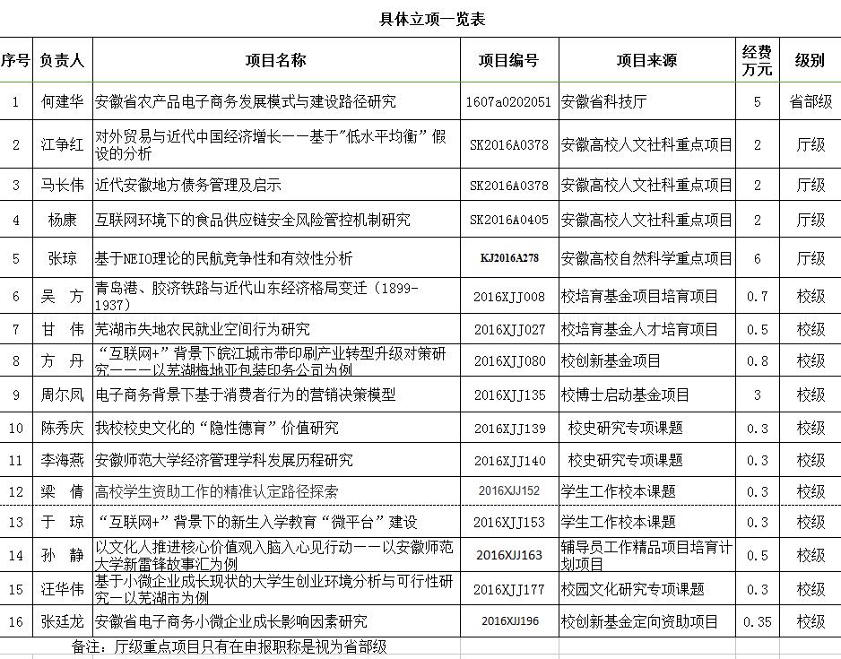 近日安徽省科技厅、安徽省教育厅以及m88官方网站登录地址都陆续下达了2016年软科学、教育厅人文科学、高校自然及校级项目的立项通知,公司共有16位老师成功立项,囊括了省部级、厅级、校级等若干纵向项目,这是公司“十三五”之年的良好开局,希望在接下来的国家社科和国家自然、教育部项目中也能有所突破大获丰收。(院科研办供稿)