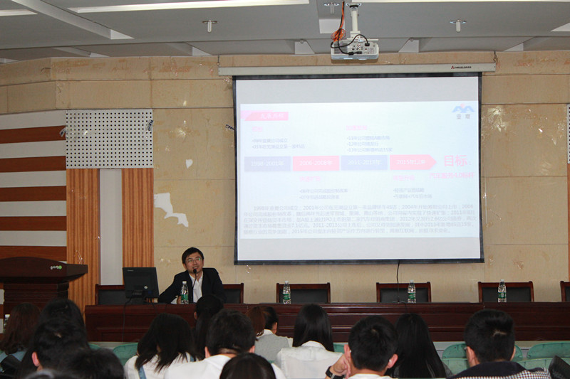 公司对企业家大讲堂活动给予了高度的重视,公司副经理张廷龙和张建华老师亲临现场并与总经理周晖进行了交流,对总经理周晖在百忙之中抽出宝贵时间来公司开展宣讲活动表示感谢,希望公司学子珍惜机会,用心聆听,有所收获。宣讲会正式开始后,周晖总经理从公司简介,新经济与市场分析,市场政策变化,16年发展战略,战略探索之路和公司未来发展战略方面对公司作详细的介绍。重点讲述了新经济下汽车产业的升级发展与就业前景,表示在信息化时代企业应实现互联网加的模式,准确利用云服务和大数据来计算和反馈市场需求。