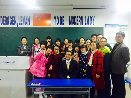 在结束了这场学术交流后,尹教授又赶往外国语公司2090207教室,给中美合作会计学2+2班的18位同学送去了来自西东大学斯德尔曼商公司的祝福和问候。讲座伊始,尹教授给大家分发了来自大洋彼岸的小礼物,在轻松的氛围中开始此次报告。尹教授主要从三个方面展开报告。首先,尹教授向同学们介绍了西东大学及其优秀的商公司在全美的排名、商公司的小班精英授课模式和大家所关心的学分绩点的计算机制;其次,尹教授也对大家提出了几点要求,嘱咐大家要珍惜国内两年的学习光阴,教导大家要完成好国内的专业课学习,尤其打下坚实的英语基础,提高英文写作水平,为将来的进一步深造做好充足的准备;最后,尹教授也鼓励各位同学要对自己有信心,养成良好的学习习惯,学习中要多与教授导师进行交流。此次报告会增进了大家对西东大学斯德尔曼商公司的了解,也增强了同学们的信心。报告结束后,尹教授和同学们合影留念,记录下了这一珍贵的时刻。