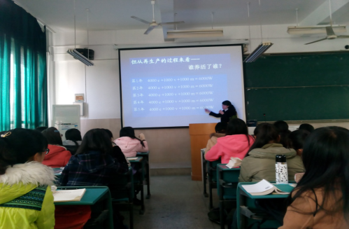 蔡老师首先和同学们一起简要回顾了上节课的主要内容,然后抛出问题自然过渡到本节课的主要内容:从对社会再生产过程的分析阐明资本积累的本质。在对简单再生产和扩大再生产概念的讲述中,蔡老师采用通俗易懂的例子加以说明。此间,蔡老师播放了一段短片,以动漫形式轻松解释了抽象概念,既生动活泼又耐人回味,让同学们在笑声中自然领会。为了进一步阐明资本主义剥削的事实,蔡老师以今年9月份的“沈阳火锅店百名员工轮番给老板下跪,感谢老板给工作”事件为案例引发员工展开讨论,并引导员工自己寻找答案。在讨论中同学们不仅锻炼了辩证思维的能力,对资本主义剥削制度又有了更深刻认识。最后,在对资本主义再生产过程进行详细分析,得出了资本积累的本质,点明了本节课的主旨后结束了课程。