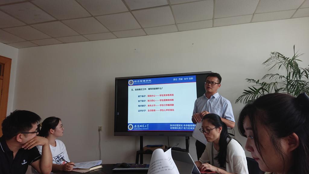 甘伟结合起草《m88官网2021年宿舍调整回迁工作方案》的体会,从组织领导、工作原则、责任分工、日程安排、后勤保障和工作要求等方面,对方案进行了解读。与会人员就方案内容与细节问题进行了深入讨论,认为要进一步明晰辅导员在宿舍搬迁工作中应该担任的任务和角色,搬迁过程要具体可实施,要做到俯下身子,现场办公——员工需求看得清;放下架子,勠力同心——员工困难摸得着;甩开膀子,身先士卒——员工行李搬得勤;迈开步子,走访宿舍——员工心声听得见。要做到变服务对象为依靠对象,行动统一,合理区分,集中装卸,安全防范,不断总结固化搬迁工作中的经验做法。要做到“号子喊得要响、腿脚跑的要勤,导员腿上有土、员工心中不堵,导员身上有汗、员工默默点赞”。宿舍搬迁工作是一场生动的思政课,通过这种集体行动,充分运用宿舍搬迁过程的生动素材,可以有效增强班级凝聚力和提高员工的集体意识,有利于一个团结友爱互助优秀班集体的建立和全体员工的成长。