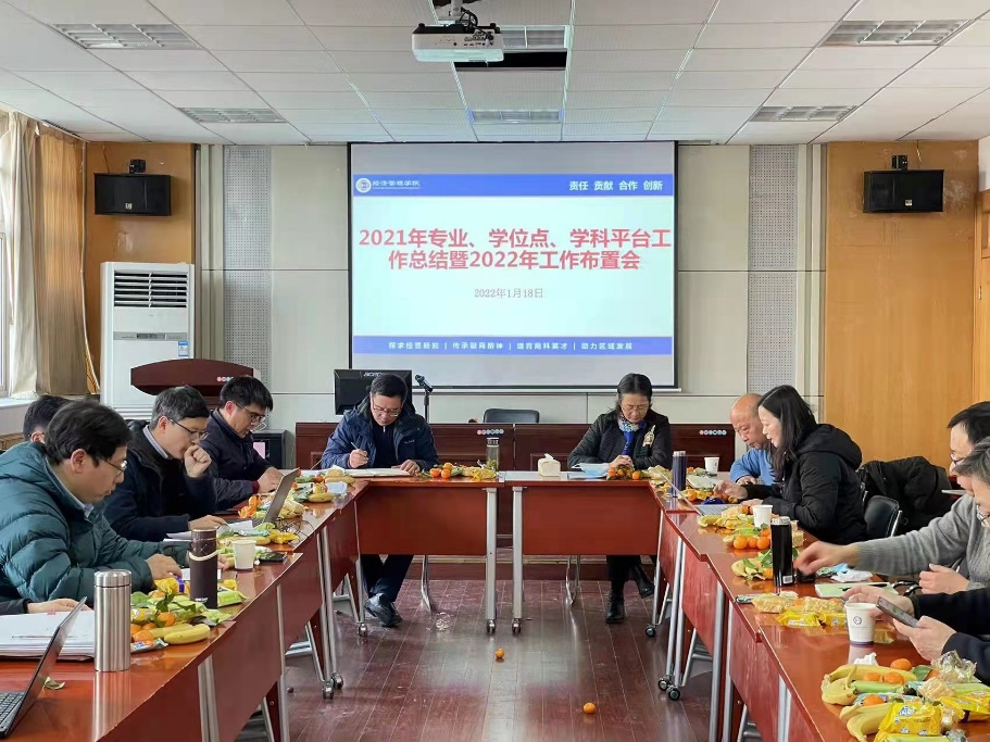 各专业、学位点、学科平台负责人从2021年取得的成绩、存在的不足与下一步的打算等方面进行了分享与交流。伍旭中就专业、学位点、学科平台方面的工作做了指导,他提出专业和学位点要进一步加强课程思政建设,鼓励师生合作发表高水平论文,扩大学科竞赛员工参与面、受益面,加强案例教学和实践教学,学科平台要提高活跃度、增加高显度、强化规范运行,着力打造省级智库。