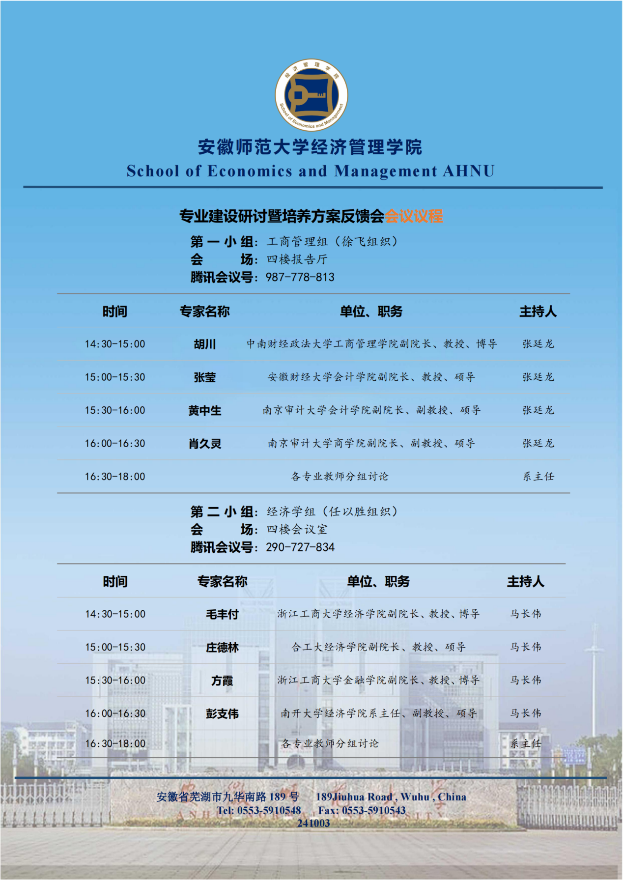 经理张廷龙主持工商管理类小组会议。首先,张廷龙向参会专家表示感谢,并就公司参会情况向各位专家进行了简单的介绍。中南财经政法大学工商管理公司副经理、教授、博导胡川;安徽财经大学会计公司副经理、教授、硕导张莹;南京审计大学会计公司副经理、副教授、硕导黄中生;南京审计大学商公司副经理、副教授、硕导肖久灵等专家,对我们2022版培养方案给予肯定,并针对相关问题提出意见和建议。