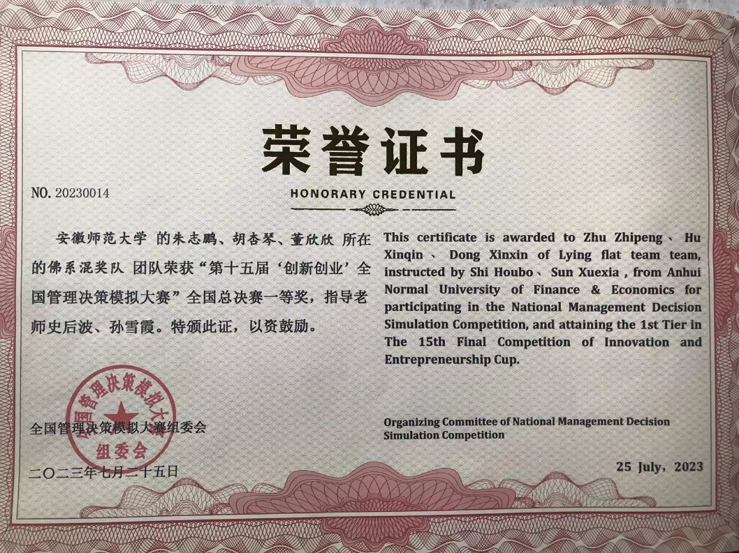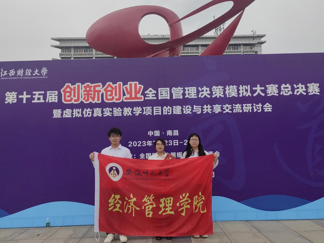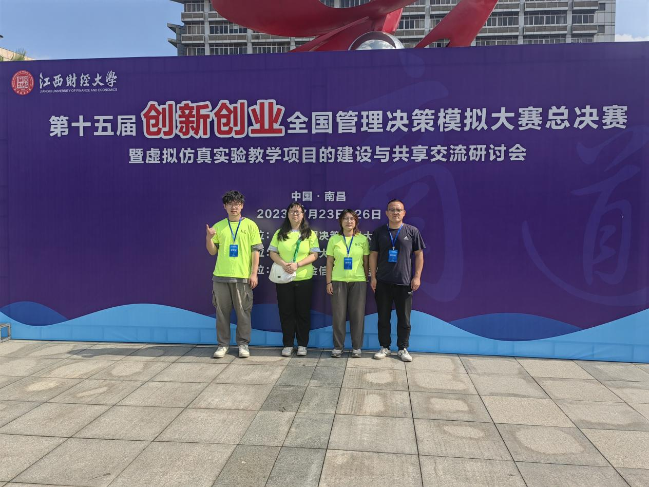 2023年7月24日至25日,第十五届“创新创业”全国管理决策模拟大赛总决赛在江西财经大学隆重举行。自开赛以来,共吸引了全国31000多支团队参加了各校组织的校内初赛,来自全国近100所高校共500余名师生参加总决赛。经过激烈角逐,我院学子在全国总决赛中再创佳绩,由史后波、孙雪霞老师指导,朱志鹏、胡杏琴、董欣欣等组成的团队荣获总决赛一等奖。本届比赛,公司参赛队伍共荣获国赛一等奖1项、三等奖5项,再次取得新突破。