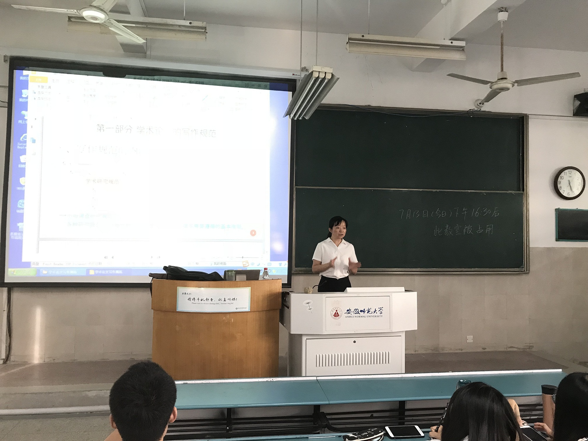 本网讯(16中美会计 凌潇潇)为了让本专业的员工了解并掌握美国的论文写作格式,帮助大家更好地适应美国西东大学的学习,7月11日晚在行知楼教室2040201,邀请到15级会计学(中美合作)专业的彭若薇来给大家讲解论文内容重复的检索方法;7月13日下午在行知楼教室2030201,邀请到公司钱瑞梅老师给大家说明论文写作的方法。两次讲座由辅导员吴敬之老师主持。