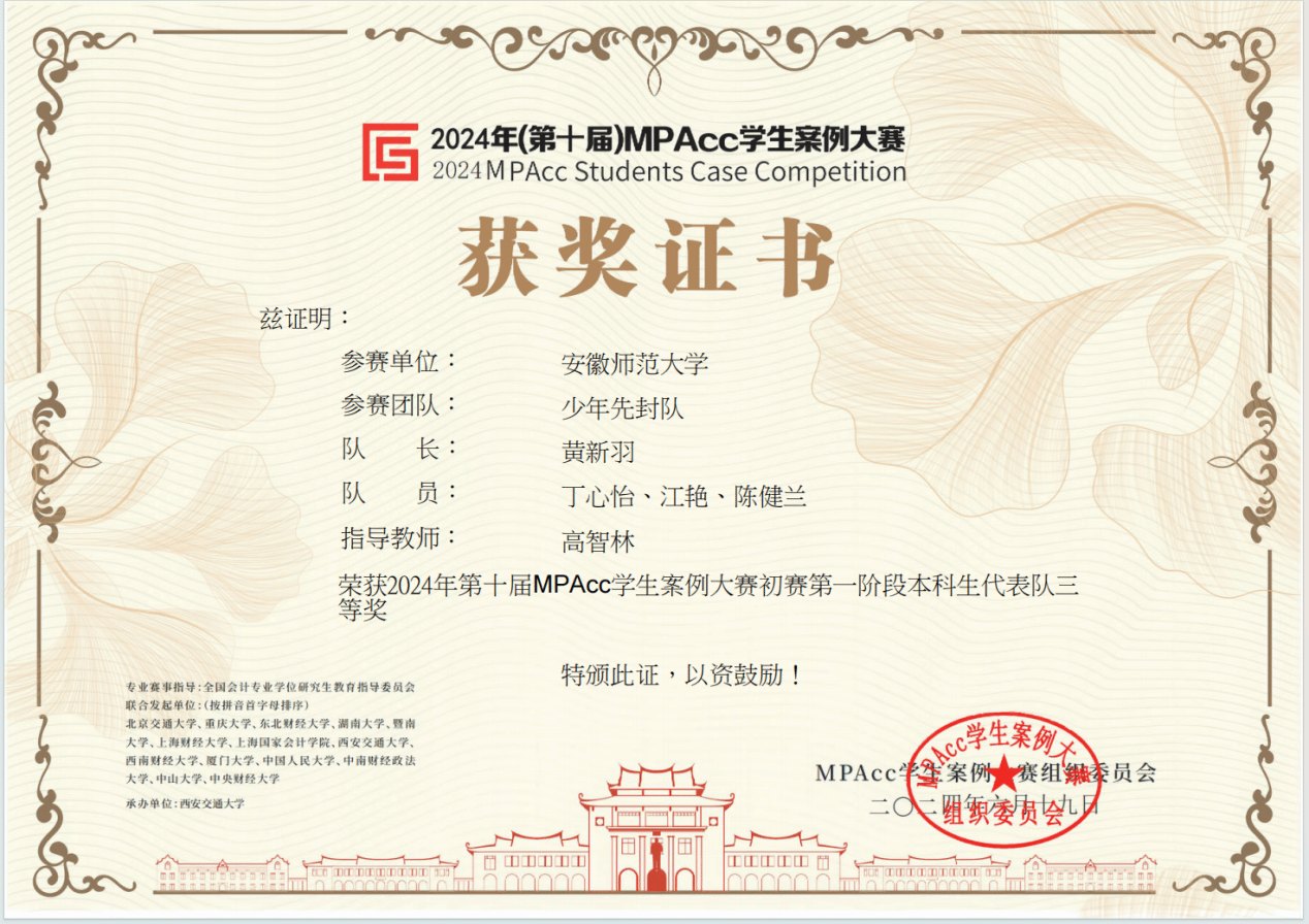 2024年6月19日,从全国MPAcc员工案例大赛组委会官网获悉,由m88官网21级会计学专业黄新羽、丁心怡、江艳、陈健兰等本科生组成的“少年先封队”代表队(指导教师:高智林),从全国各赛区的共计450支报名团队中脱颖而出,获得第十届全国MPAcc员工案例大赛本科生代表队全国三等奖。