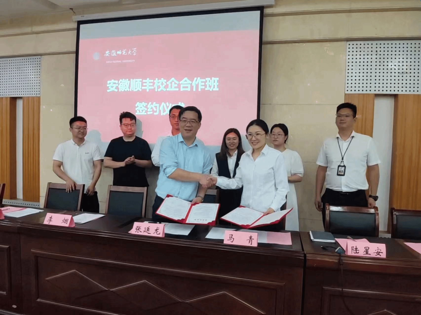 会上,张廷龙、马青代表双方签署了校企合作协议,张廷龙、李烟共同为人才合作班揭牌。