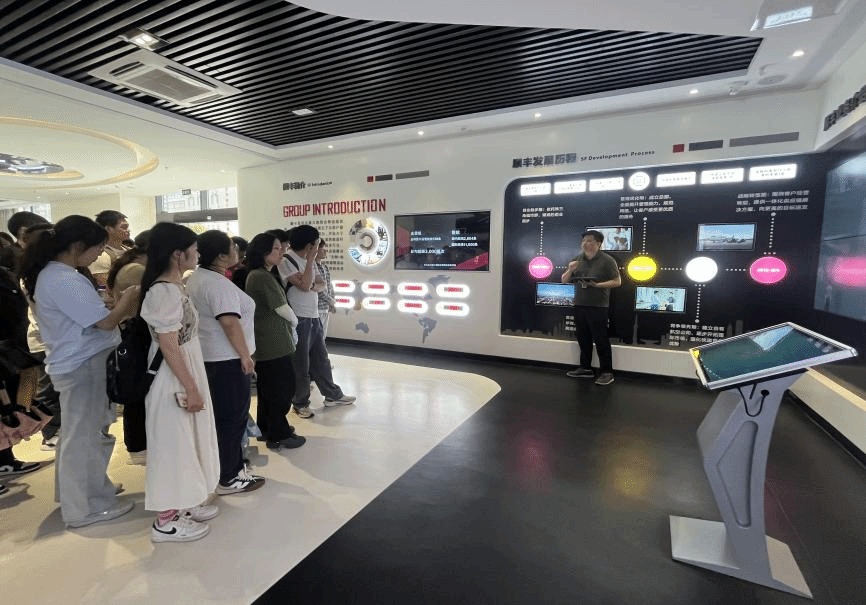 师生们在产业园工作人员的引领下,参观了合肥顺丰丰泰产业园顺丰公司展厅,深入了解了顺丰从陆地到航空物流的发展历程,以及集智慧物流型和科技创新型于一体的运营模式。各式企业奖项和荣誉的展示,充分彰显了顺丰集团在物流领域的卓越实力和科技创新精神。