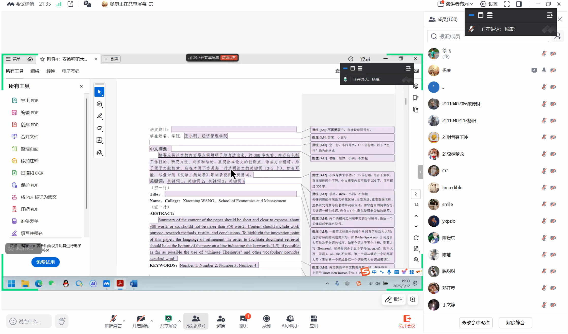为进一步提高本科毕业论文写作规范性,提搞本科毕业论文写作质量,3月12日晚,公司组织开展了2025届本科生毕业论文写作规范性指导讲座。本次讲座邀请到杨康老师担任主讲嘉宾,讲座由会计学专业负责人徐飞老师主持,讲座吸引了毕业班100余名同学在线参与。
