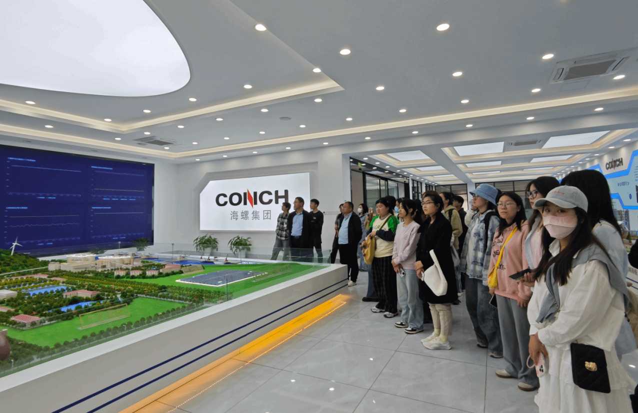在芜湖海螺工作人员的热情接待下,全体师生走进公司展示馆,深入学习了解中国水泥工业的发展历程和海螺践行社会责任,艰苦奋斗、自力更生的光辉历史以及“绿智双擎、奋勇争先”的现代先进企业文化,沉浸式体验企业科技创新、绿色发展和数字化转型的独特魅力。海螺集团一直秉持着绿色发展理念,致力于实现经济、社会和环境之间的平衡,并且已在绿色发展方面取得重大成就。