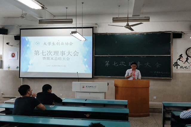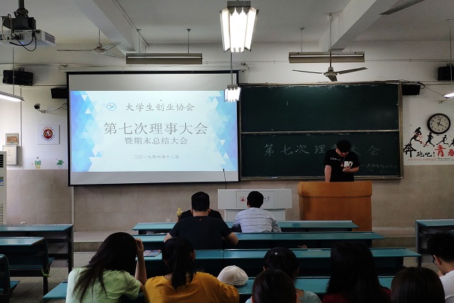 本网讯(老员工创业协会新闻部 陆玉凤)时光荏苒,光阴飞逝,在本学期结束之际,为推动老员工创业协会的长久发展,提高创协全体成员的工作效率,激发工作热情,创协于6月12日16:00在行知楼2020204教室举行“第七次理事大会暨期末总结大会”,创协全体内部成员参加此次大会,会议由公关部理事陶聿彬主持。