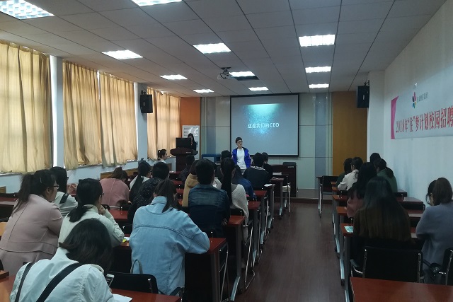招聘会伊始,王曦瑶对集团的成长历程、旗下品牌、企业文化、人才培养及薪酬待遇等方面较为全面的讲述,毕业生有了初步的了解。随后,住友酒店集团副总裁欧磊上台宣讲,她从自己的求职过程出发,向毕业生传授择职中的相关经验,同时,对于住友集团,她强调集团是一个注重组织发展和个人发展相统一的企业,其以快乐为住的企业文化,有利于员工的长足发展,而集团也为员工的职业发展制定了相关计划。在欧副总裁宣讲结束后,工作人员还特别播放了11级学姐张娜(现住友酒店北京分店店长)录制的视频,视频中张娜学姐鼓励学弟学妹们加入住友,并祝贺母校九十周年生日快乐。