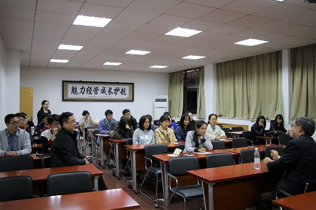 随后尹教授和大家展开互动。例如袁开璇问道在美国西东大学毕业后,是否有机会在华尔街工作。尹教授说如果想在华尔街工作的话,学分绩点必须在4.0左右才有可能,另外还需要自己的奋斗。郑琳问道西东大学的大四员工是否和国内员工一样实习找工作,对此尹教授说美国的大学大四年级的员工主要还是在校学习,但员工们会利用暑假时间去实习,作为商业实践活动。还有其他同学向尹教授询问了一些问题,尹教授都做了详细的解答。