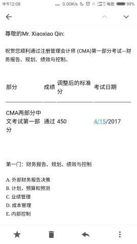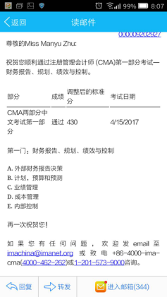 公司首期CMA合作培养班学员参加了CMA(美国注册管理会计师)4月份Part 1的统考,5月20日统考成绩公布,参考的18人中,共有14人顺利通过考试,通过率高达77.7%,400分以上学员共有9人,其中14财务管理的秦霄霄(450分)和14会计的诸漫玉(420分)获得了中博诚通提供的CMA好员工奖学金1500元。