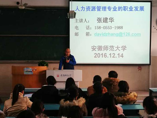 2016年12月14日下午2:00,16级人力资源管理专业第四次导论课在2010302教室展开。本次导论课以“人力资源管理专业职业发展”为主题,由张建华老师为我们讲解。首先,张老师提出一个问题:我们为什么选择人力资源管理专业。团支书方颖同学对此问题进行回答,她称:“当初选择人力资源管理专业是看好人力资源管理的就业前景,并从多方面考虑了亲人、朋友的建议。”随后进入本次导论课正式内容,张建华老师将课程分为四个模块,分别是:一、如何理解人力资源管理;二、人力资源管理者的职业素养;三、HR人员的将来。张老师为同学们讲述了许多个人经历,并提到:学习人力资源管理相关知识后,应马上参加社会实践,在实践中检验理论。