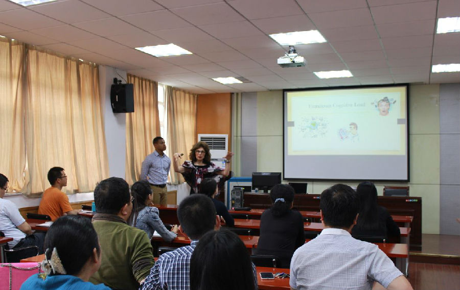 除了向大家展示先进的教学技术外,Boroff教授还总结分享了她执教多年的教学经验与反思。她和在座的教师们讨论了课堂上可能出现的降低员工听课效率的几种因素,并陈述了她是如何针对这几种影响因素改善课堂设计的成功经验。