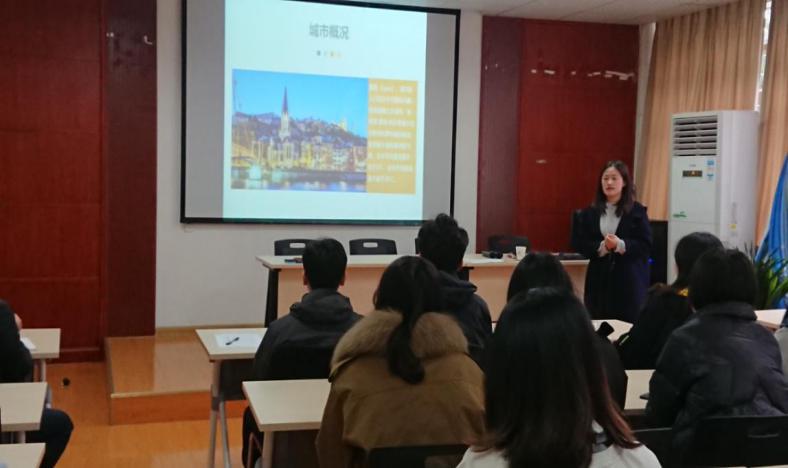 首先,朱老师向我们介绍了法国里昂的城市概况,在充分领略了异国别样的地域位置、天气气候、人文风情后,又以图文并茂的形式介绍了即将奔赴的商公司,让同学们在满足好奇心的同时,也减少了对他乡城市的陌生感。