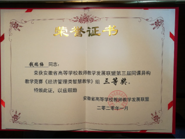 钱瑞梅老师以“基于智慧教学模式的《国际金融》教学设计方案”为题参加了智慧教学竞赛环节,该项目的智慧教学设计方案受到现场的评委和选手们的好评,荣获经管综合组三等奖。