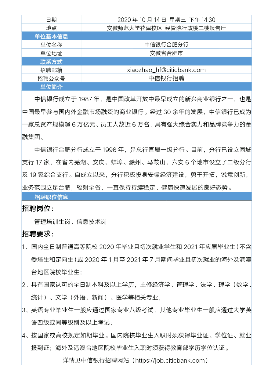 【职业发展—就业】中信银行合肥分行校园招聘信息