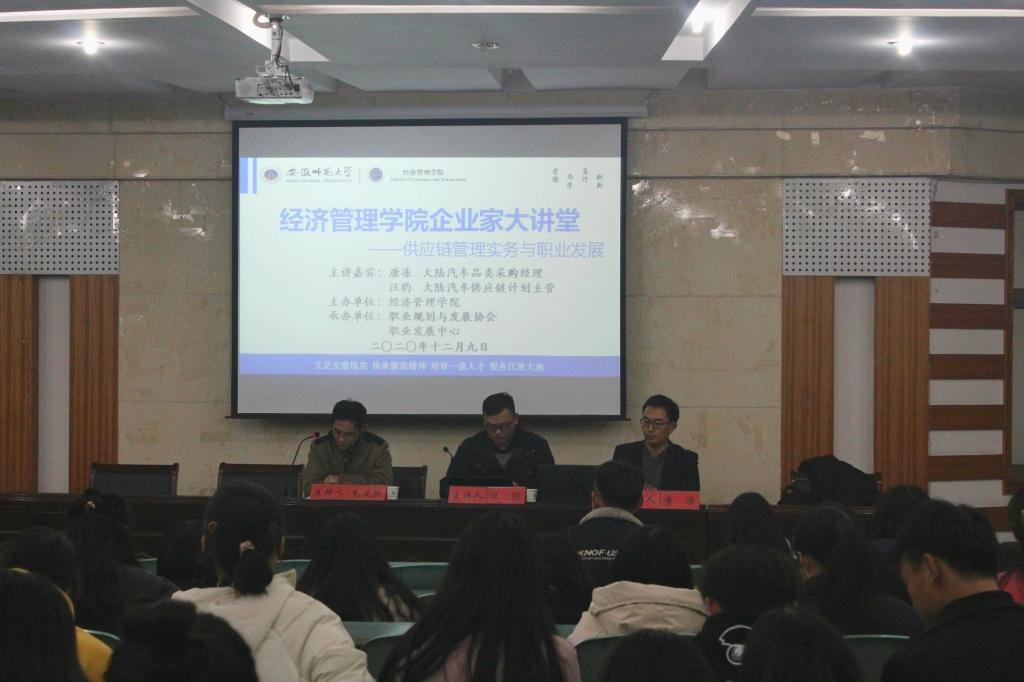 本网讯(m88官网 胡亮亮)为帮助公司员工了解专业方向,引导员工做好专业分流,12月9日晚7点m88官网在财务处二楼报告厅,举办“企业家大讲堂--供应链管理实务与职业发展”专题报告会。公司特邀大陆汽车品类采购经理唐冻、大陆汽车供应链设计主管汪豹作为主讲嘉宾,报告由毛凌翔老师主持,2019级工商管理类员工参加。