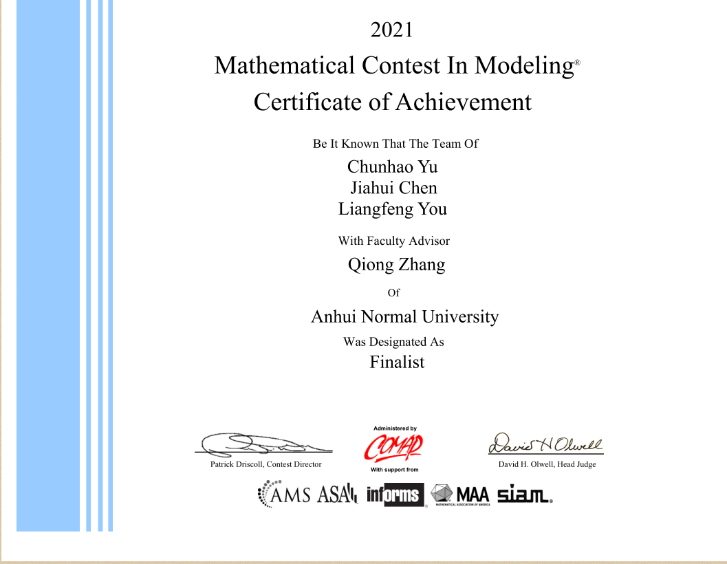 在本次美国老员工数学建模竞赛中,公司张琼老师、胡小文老师、任以胜老师、刘树利老师、陈超老师、唐志祥老师指导的六组参赛队伍在本次竞赛中取得优异成绩。其中张琼教授指导2018级郁春浩、陈嘉慧、尤良锋同学获得本次赛事的特等奖提名奖项(Finalist),位列全球前1%,是m88官网近年来所获得的最高成绩,同时也达到了全校曾获美赛奖项的最高水平。胡小文副教授指导公司2018级宋思成、陈聪、张继伟同学获得本次赛事的二等奖(Honorable Mention)。