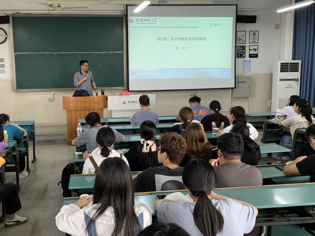 观摩课上,陈龙老师首先回顾了三段论的四个基本规则并强调了其重要程度。回顾完后开始讲述本节课程的主要内容——复合判断。课堂上,陈老师以贴合生活的例子引入什么是复合判断,并用四个例子简明扼要地解释了四种不同类型的复合判断。随后,以生动的案例加强同学们对知识点的理解,强调理解记忆的重要性。在授课过程中,陈老师声音洪亮、逻辑严谨、条理清晰、风趣幽默,积极与同学们展开互动,课堂气氛活跃,教学效果良好。