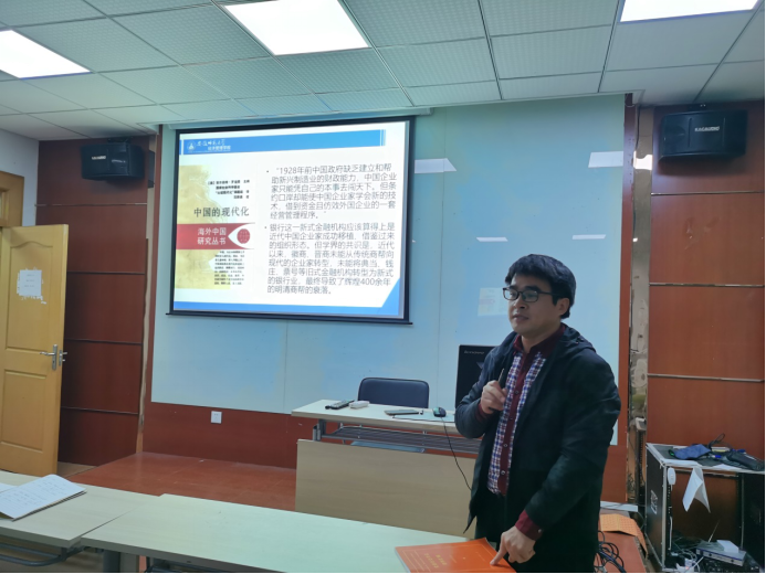 报告由徽商典当业的衰落切入,通过对徽商投资银行业的“资本”要素分析,对徽商转型失败的制度因素进行深究,提出近代徽商也曾探索向近代银行业转型之路,但是,徽商传统上的盐业、茶业、木业均已是日落西山,徽商物质资本匮乏。相比,宁波商帮的留学人员从事银行业,徽商的人力资本落后。宗族背景下形成的宗族网络,形成狭隘的信任关系,徽商银行业缺少相应的产业彼此渗透,支持,社会资本落伍;再加上碍于正式制度与非正式制度的双重制约。最终,徽商向银行业转型之路中断,徽商创办的茶叶银行、安徽商业储蓄银行等如同昙花一现,未能扭转徽商彻底衰落的结局。报告会中,与会教师同马长伟副教授展开了充分的交流和讨论。