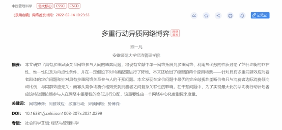 近日,公司熊一凡博士的学术论文《多重行动异质网络博弈》被权威期刊《中国管理科学》录用,并在线发表。