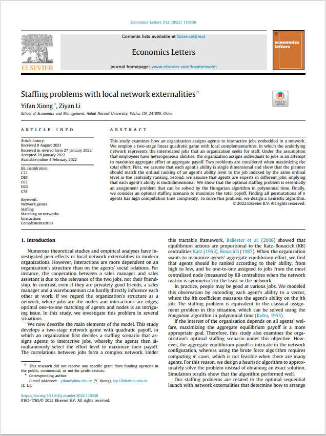 近日,公司熊一凡和李紫雁博士合作论文“Staffing problems with local network externalities”被经济学国际知名期刊Economics Letters接受并发表。