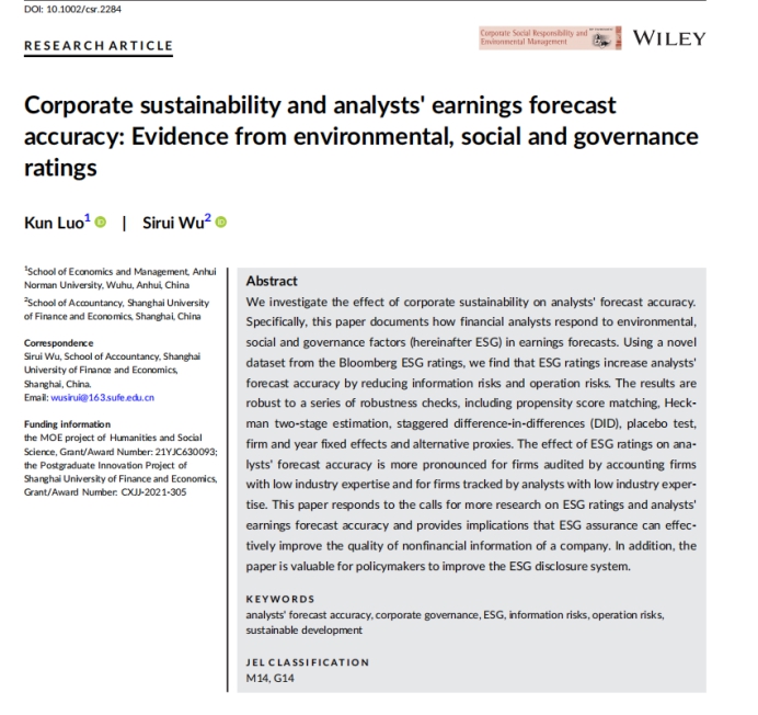 近日,公司罗昆老师的论文“Corporate sustainability and analysts' earnings forecast accuracy: Evidence from environmental, social and governance ratings”被管理学国际知名期刊Corporate Social Responsibility and Environmental Management 接受并在线发表,合作者为上海财经大学会计公司的吴思锐博士生。