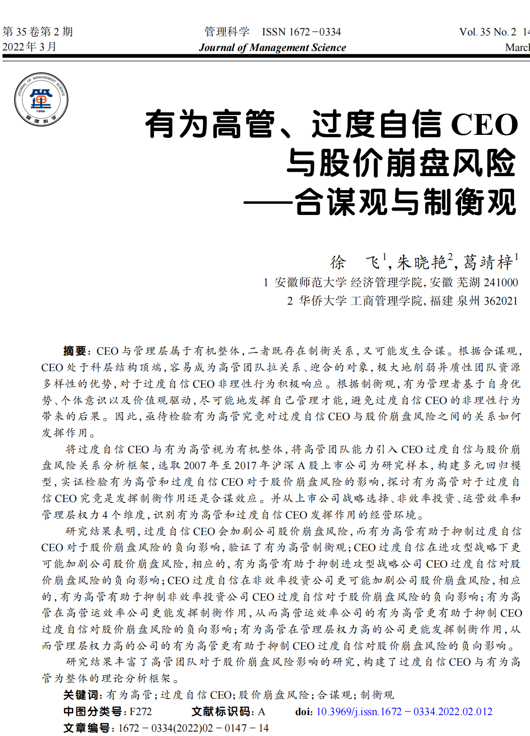 近日,公司徐飞老师的论文“有为高管、过度自信CEO与股价崩盘风险—合谋观与制衡观”被国家基金委A刊《管理科学》正式发表,合作者为徐飞老师指导的硕士研究生朱晓艳、葛靖梓。
