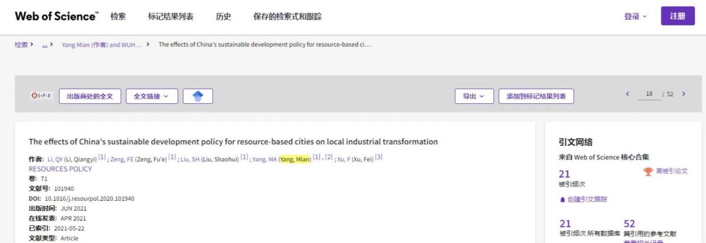 另外,徐飞老师2021年与武汉大学经济与管理公司杨冕教授团队在《Resources Policy》合作发表的“The effects of China,s sustainable development policy for resource-based cities on local industrial transformation”(影响因子:8.222,SSCI一区期刊)入选ESI高被引,截止目前,该文Web of Science被引26次。徐飞老师为本文共同通讯作者。
