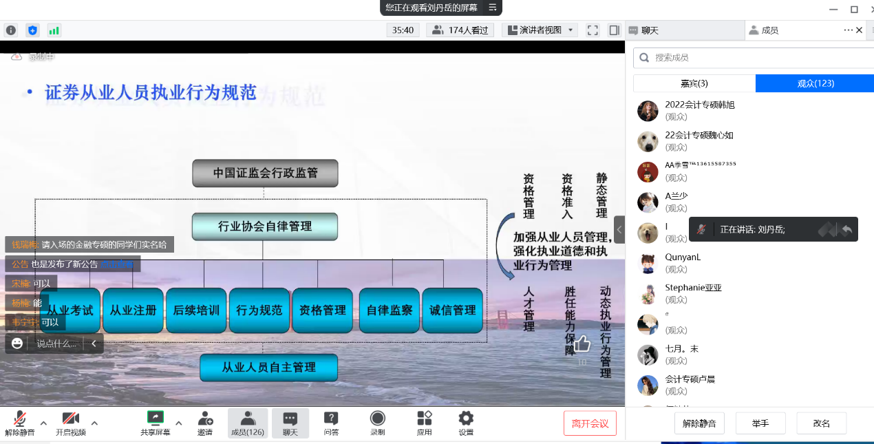 吴蕾女士则进一步详细介绍了内幕交易、市场禁入等六大经典案例,加深了同学们对各类金融业务规范的体会和理解。