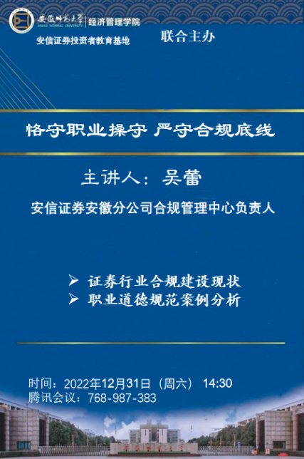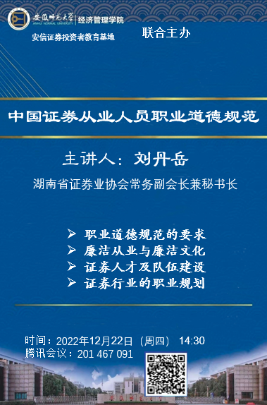 这一期的开放课堂环节有幸邀请到了湖南省证券业协会常务副会长兼秘书长刘丹岳先生和安信证券安徽分公司合规管理中心负责人吴蕾女士,他们先后于2022年12月22日下午和31日下午,分别以《中国证券从业人员职业道德规范》和《恪守职业操守 严守合规底线》为题进行了专题讲座。