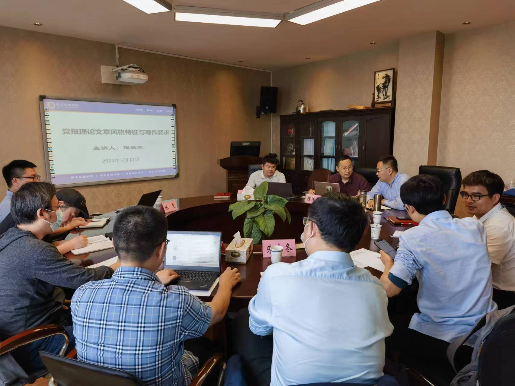 5月17日下午,m88官网邀请安徽日报理论部主任编辑程铁军来院作题为“党报理论文章的风格与写作要点”的专题报告,研究生院副经理韩玉刚,m88官网副经理伍旭中、马长伟,各学科平台、学位点负责人,以及青年骨干教师近20人参加报告会,报告会由伍旭中主持。