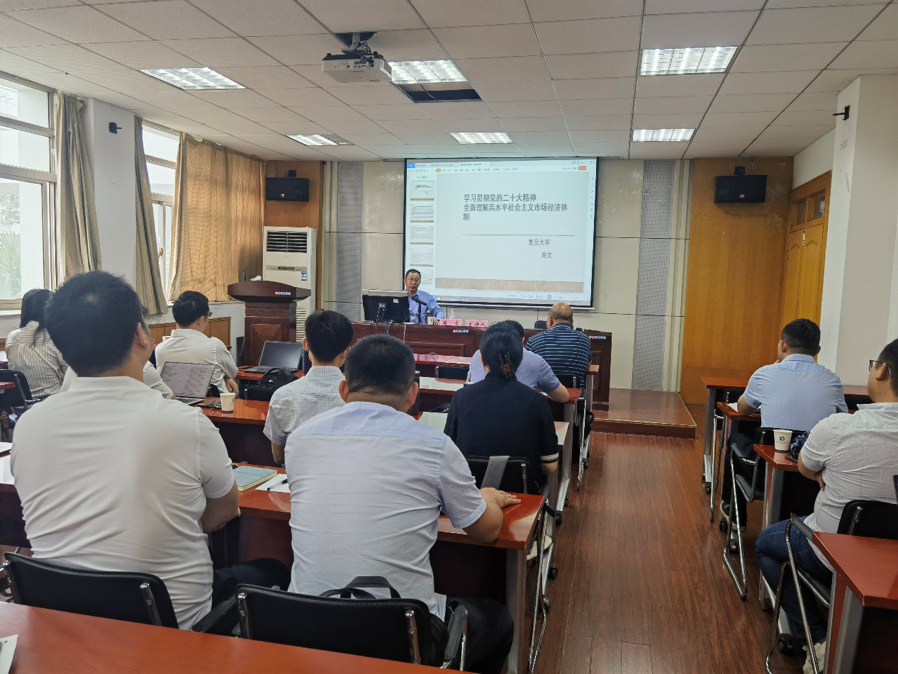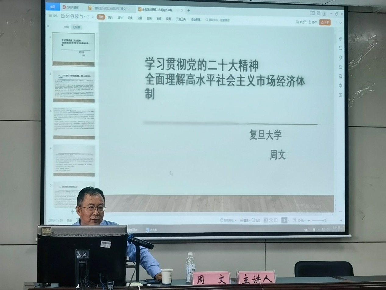 5月30日上午,为深入开展学习贯彻习近平新时代中国特色社会主义思想主题教育,m88官网专门邀请复旦大学马克思主义研究院副经理、马克思主义经济学中国化研究中心主任周文教授在公司二楼报告厅开展题为“学习贯彻党的二十大精神 全面理解高水平社会主义市场经济体制”的专题讲座。m88官网副经理伍旭中、马长伟以及党员教师、本科生、研究生代表等参加讲座,讲座由伍旭中主持。