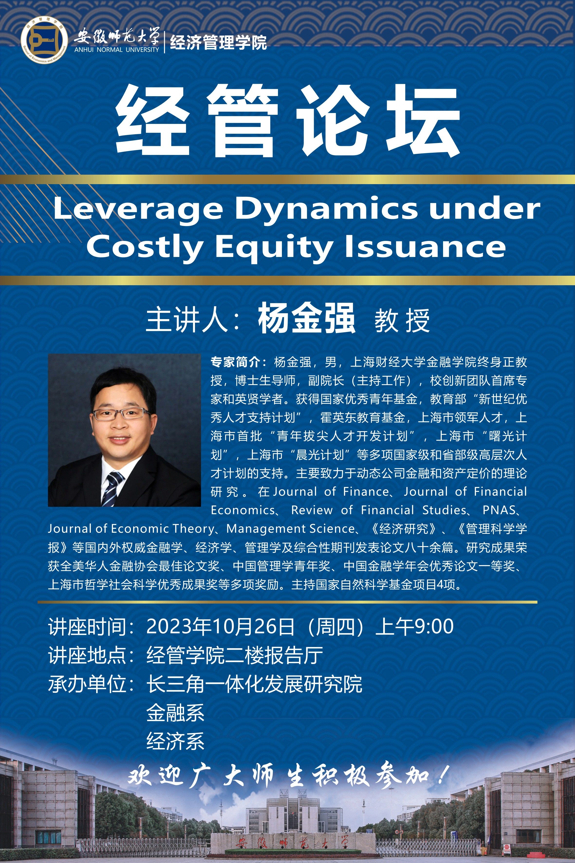 【学术讲座预告】杨金强:Leverage Dynamics under Costly Equity Issuance