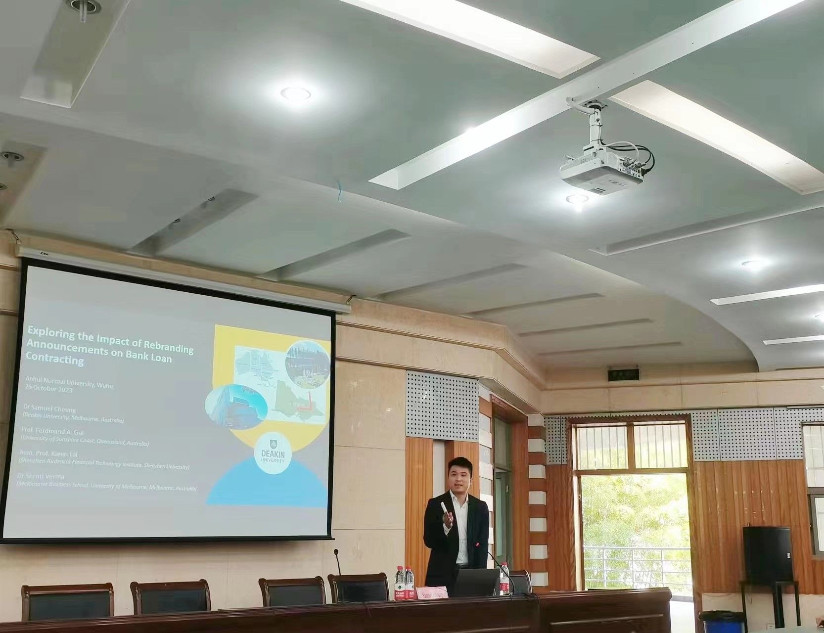 10月26日下午,m88官网企业发展研究院、财务会计系以及财会教职工党支部联合承办了一场精彩纷呈的国际学者讲座。本次讲座特邀澳大利亚迪肯大学商公司会计系高级讲师、国际事务处主任Samuel Cheung 博士分享其对于“Exploring the Impact of Rebranding Announcement on Bank Loan Contracting”论文撰写的研究思路和研究过程,传达学术思想和成果。财务会计系部分老师以及相关专业研究生参加此次讲座。讲座由罗昆老师主持。
