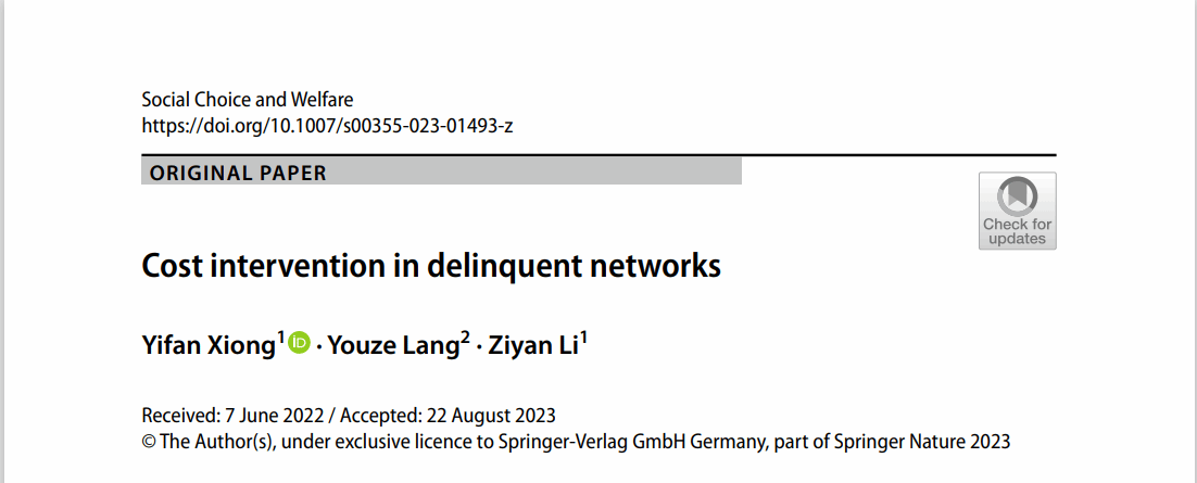 近日,公司熊一凡博士(第一及通讯作者)的合作论文Cost intervention in delinquent networks被福利经济学国际权威期刊Social Choice and Welfare接收并在线发表。文章的另外两位作者分别是来自于复旦大学六次产业研究院的青年副研究员郎有泽博士和m88官网的李紫雁博士。文章全文链接参见:https://doi.org/10.1007/s00355-023-01493-z。Social Choice and Welfare是国际社会选择与社会福利学会(The Society for Social Choice and Welfare)的官方期刊,在ABS期刊评级中被评为3星期刊。