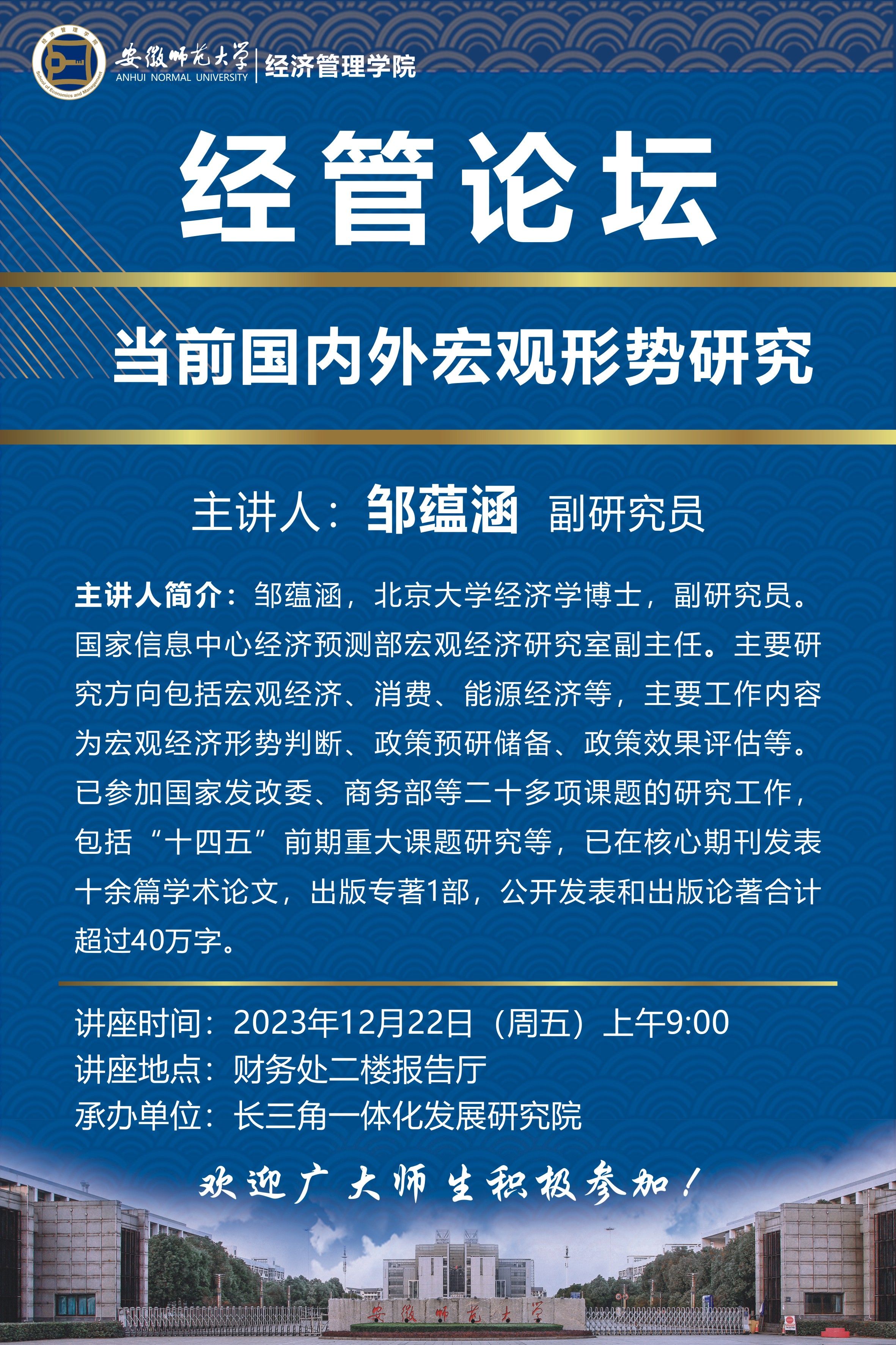 【学术讲座预告】北京大学邹蕴涵:当前国内外宏观形势研究