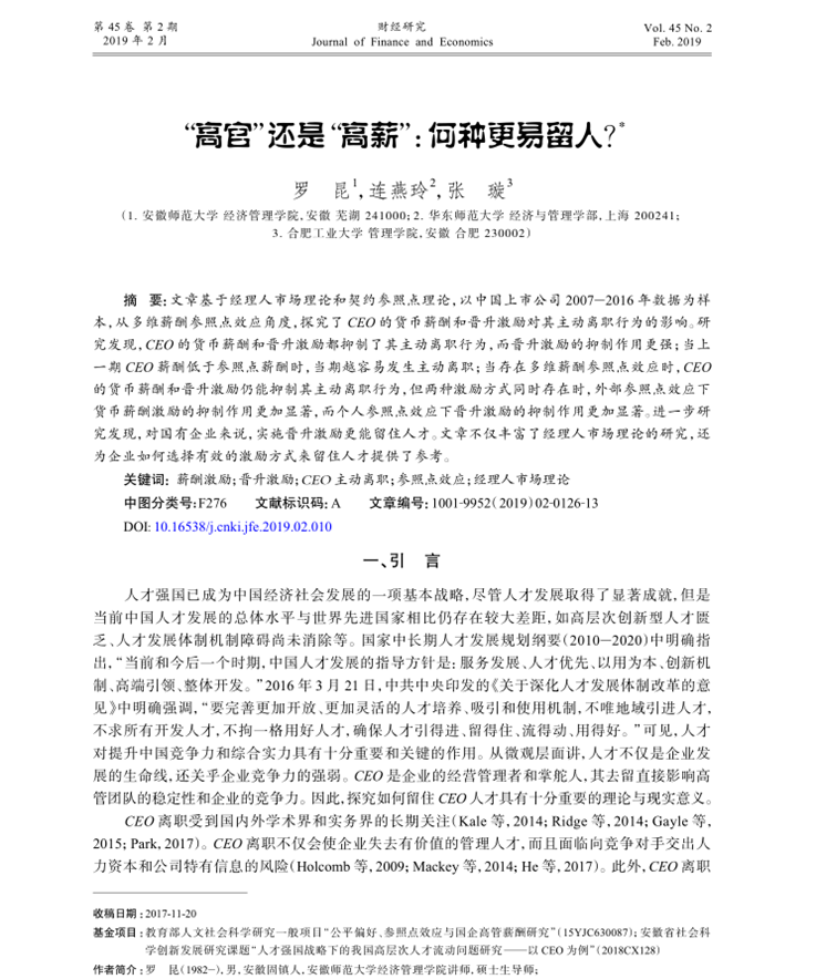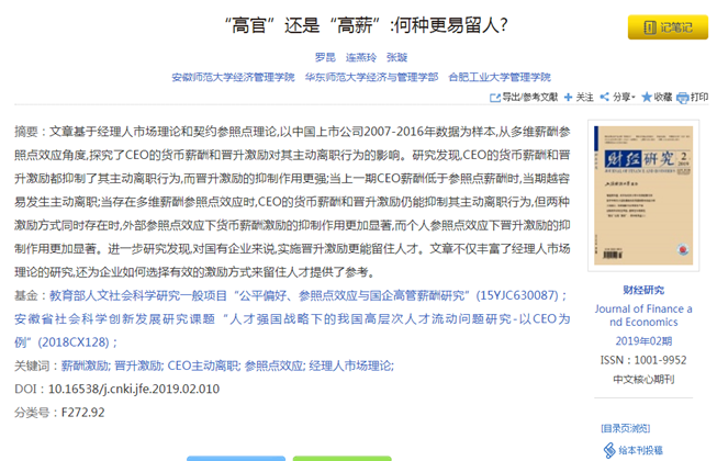 m88官网 吴春玲)公司教师罗昆博士的又一篇C刊论文《“高官”还是“高薪”:何种更易留人?》被《财经研究》2019年第2期录用发表。